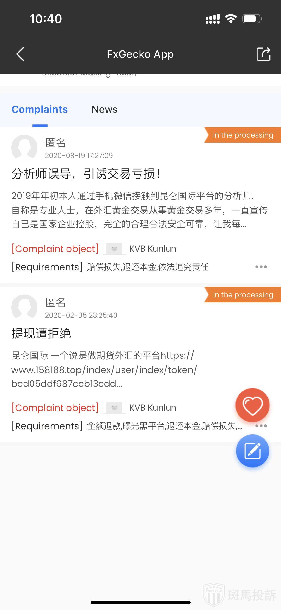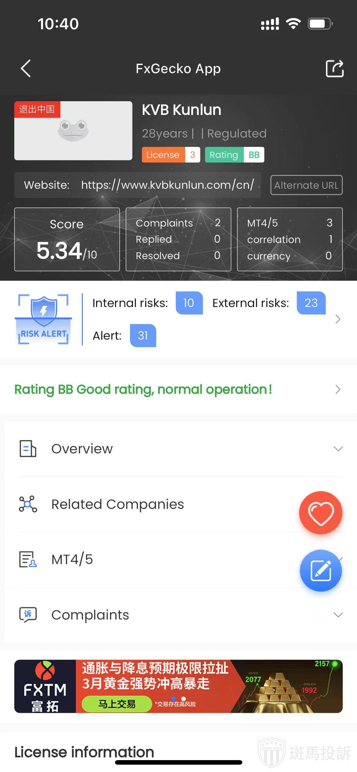 FTI has received 2 complaints about KVB Kunlun forex broker so far.