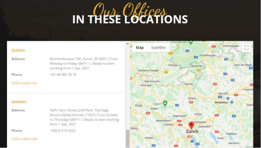Finally, we checked some of the locations mentioned where the company is active. Most of the addresses we checked are public office locations rented out by Servcorp, a company that sells virtual office spaces. The address in Zurich we search up on google maps and found only a Rituals shop.