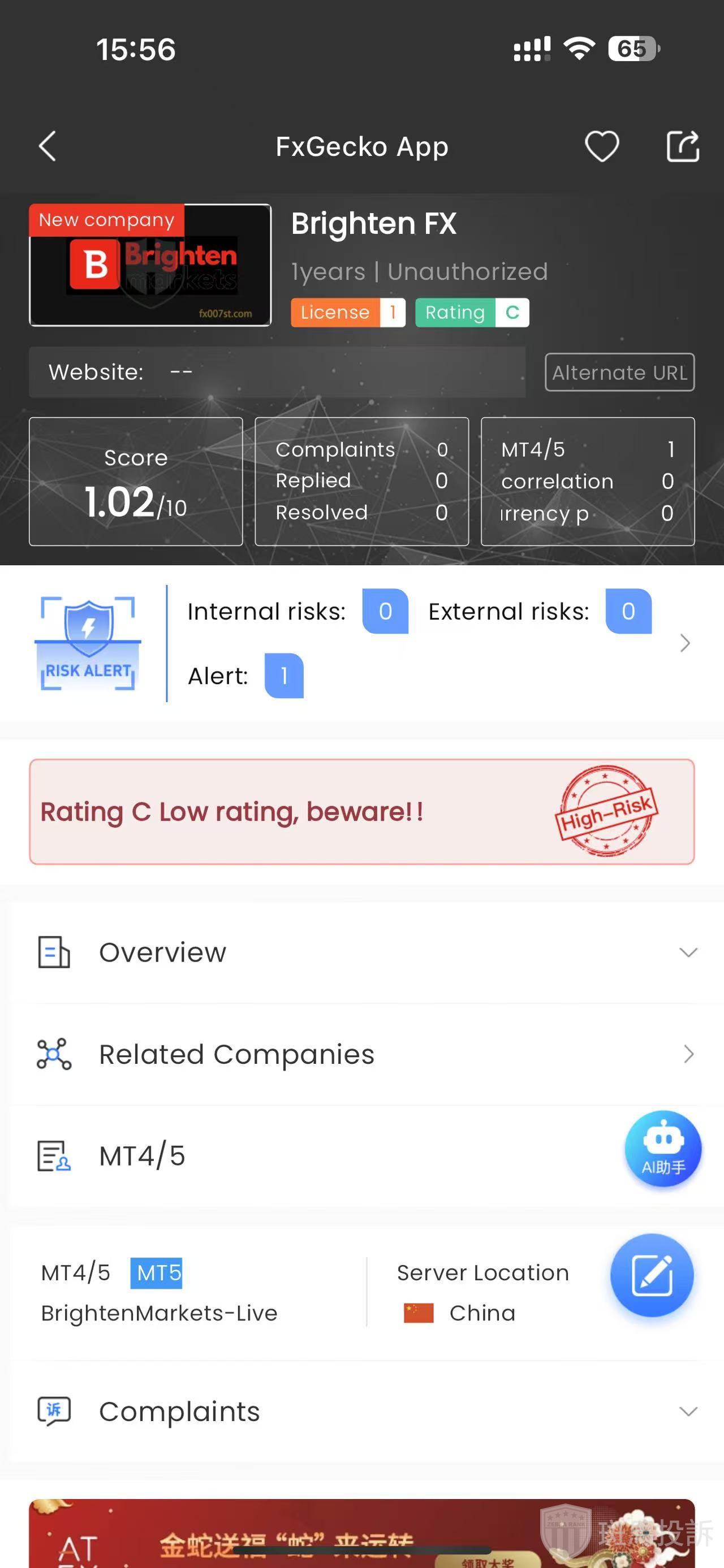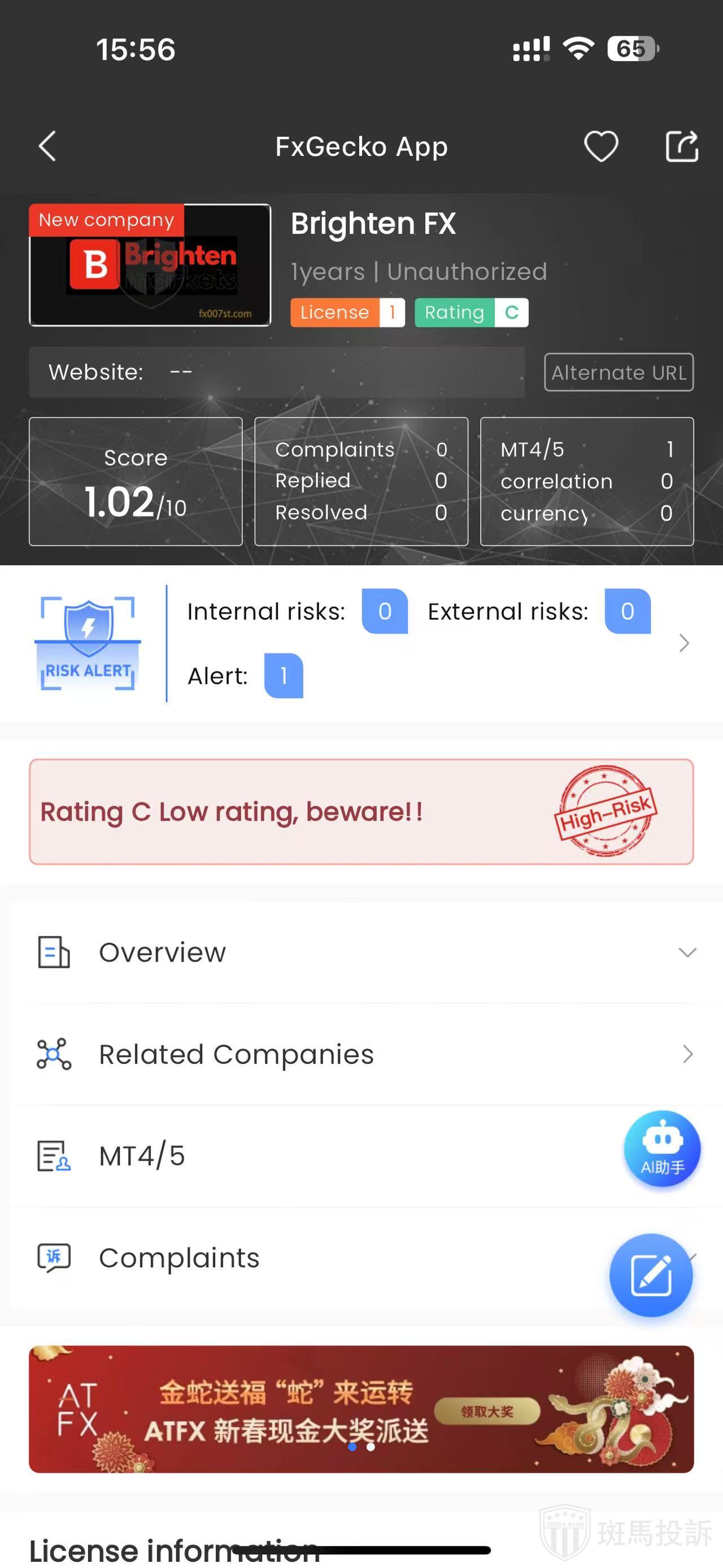 FTI risk warning shows that Brighten FX has 1 risks. Investors need to pay attention to the relevant risk alerts for this broker.