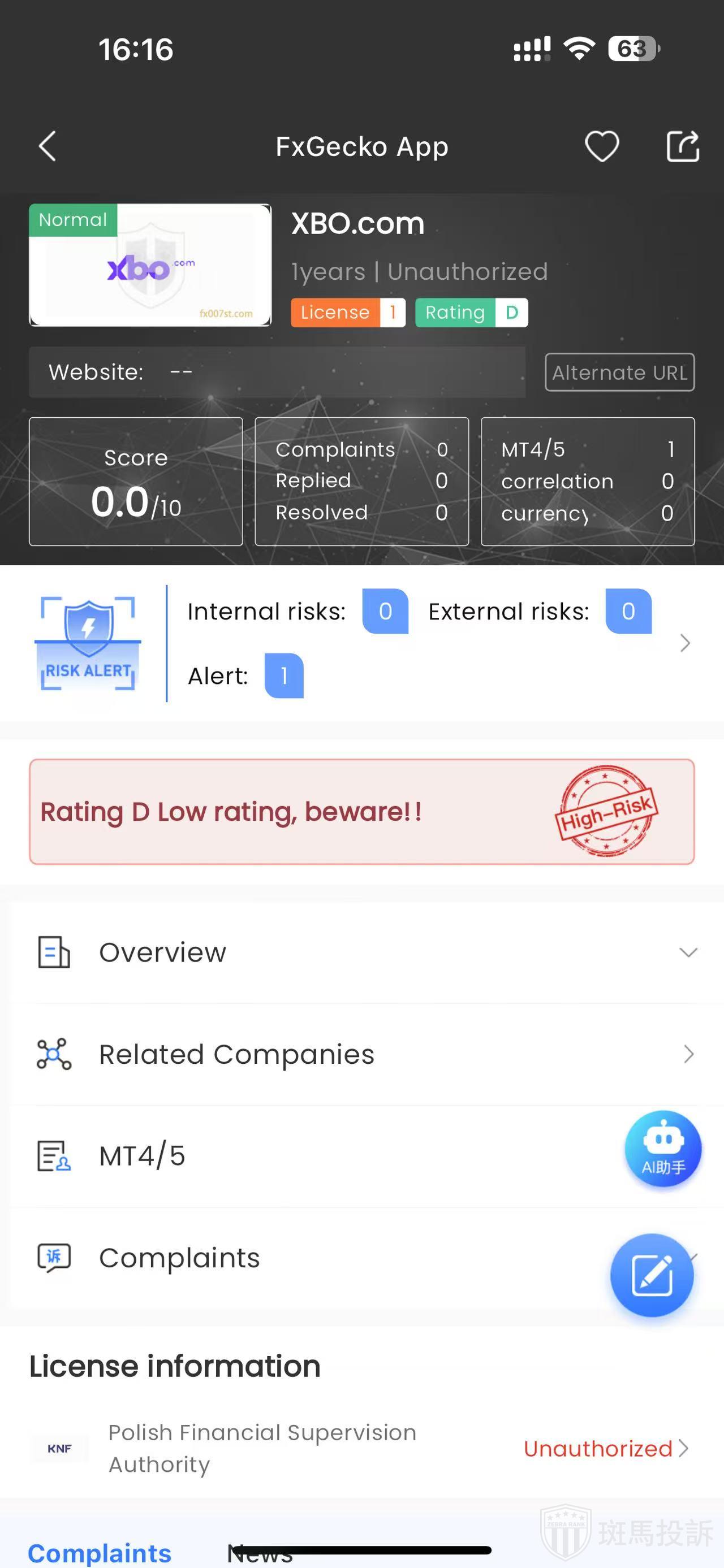 FTI risk warning shows that XBO.com has 1 risks. Investors need to pay attention to the relevant risk alerts for this broker.