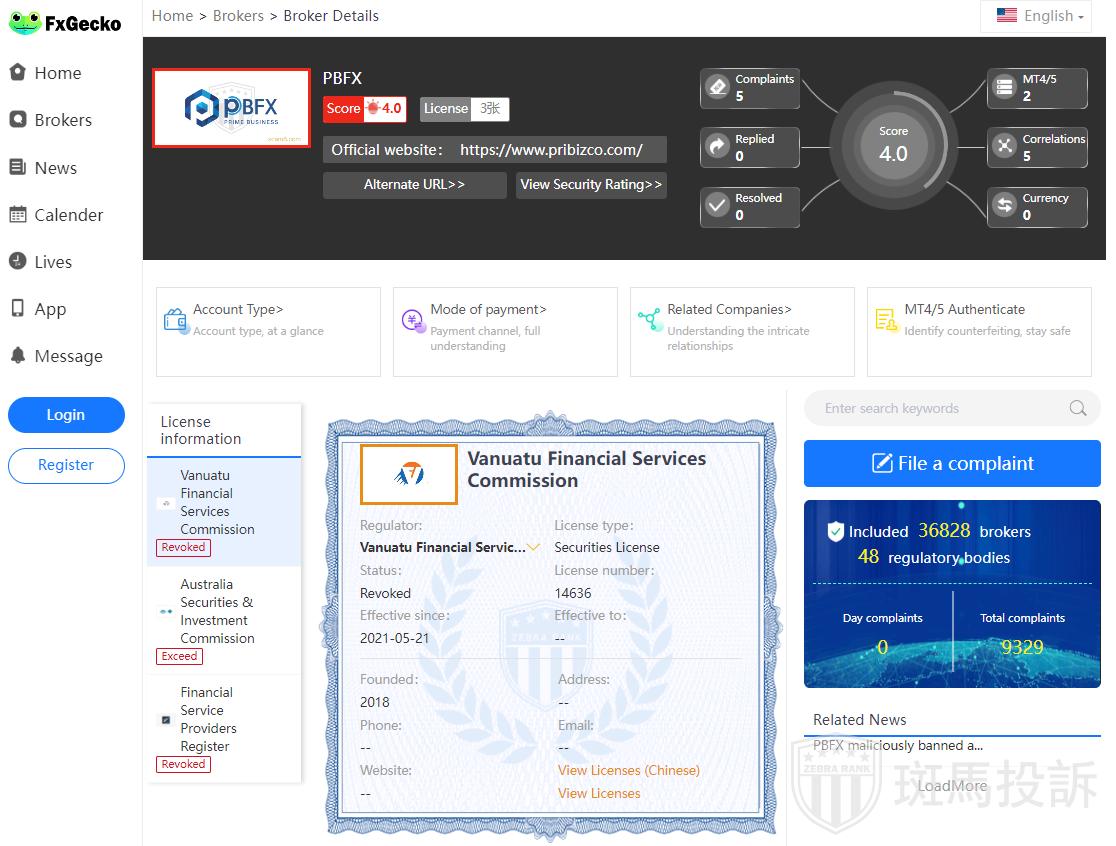 Currently, the forex broker PBFX that we searched for is registered with 3 financial regulators, but 2 of them are revoked and one of them has not obtained a forex license. This is a high risk signal, so be careful!