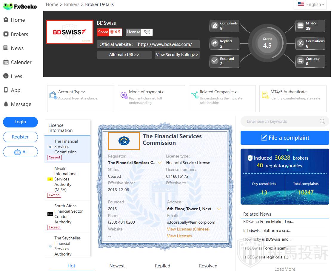 FSA (Seychelles): BDSwiss Holding Ltd has obtained a securities licence with regulatory certificate number SD047.
