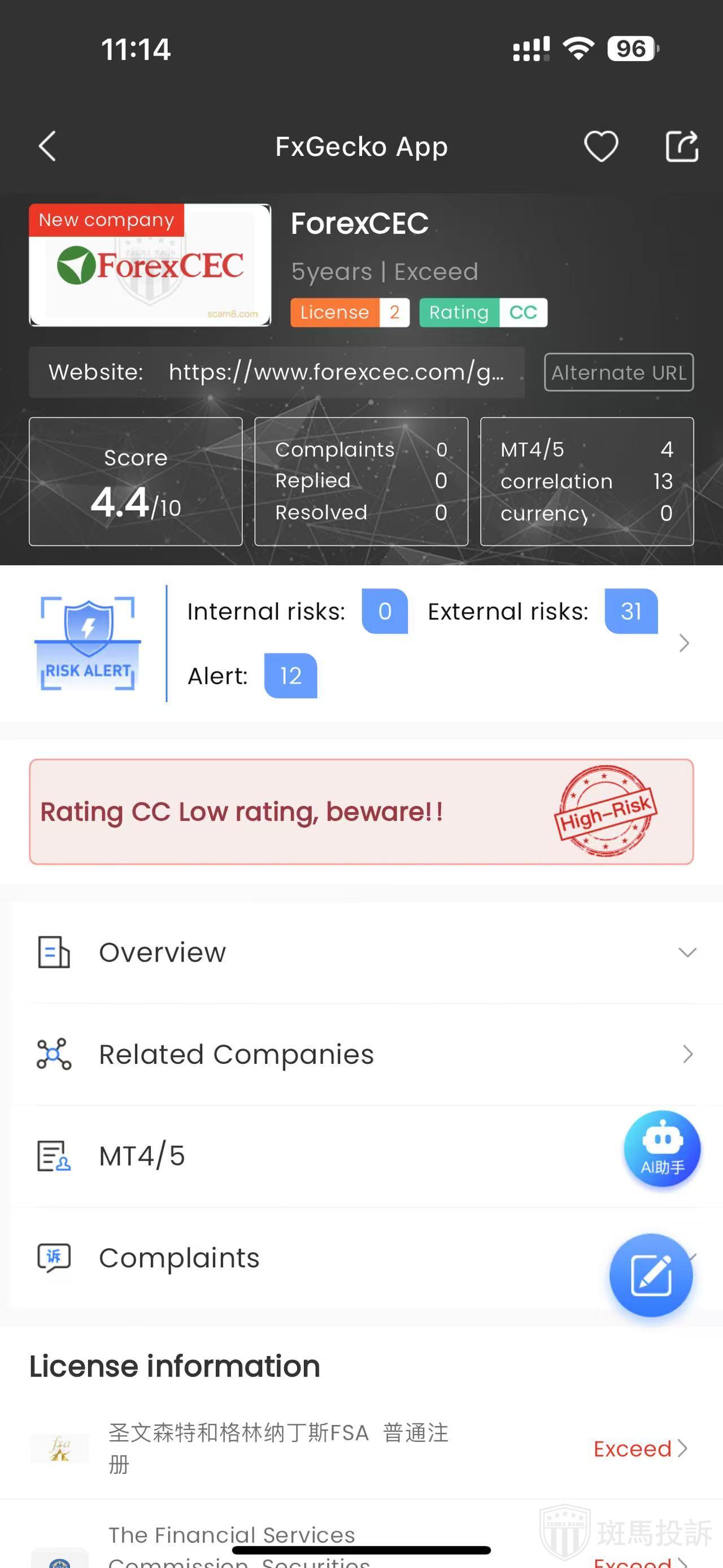 According to the FTI search, this platform, called ForexCEC, was established in 2020, ranks 1539th globally, has a safety score of 50, and currently holds two regulatory licenses: a general registration from the Financial Services Authority (FSA) of Saint Vincent and the Grenadines and a securities license from the Financial Services Commission (FSC) of Mauritius, with 42 risk scan alerts.