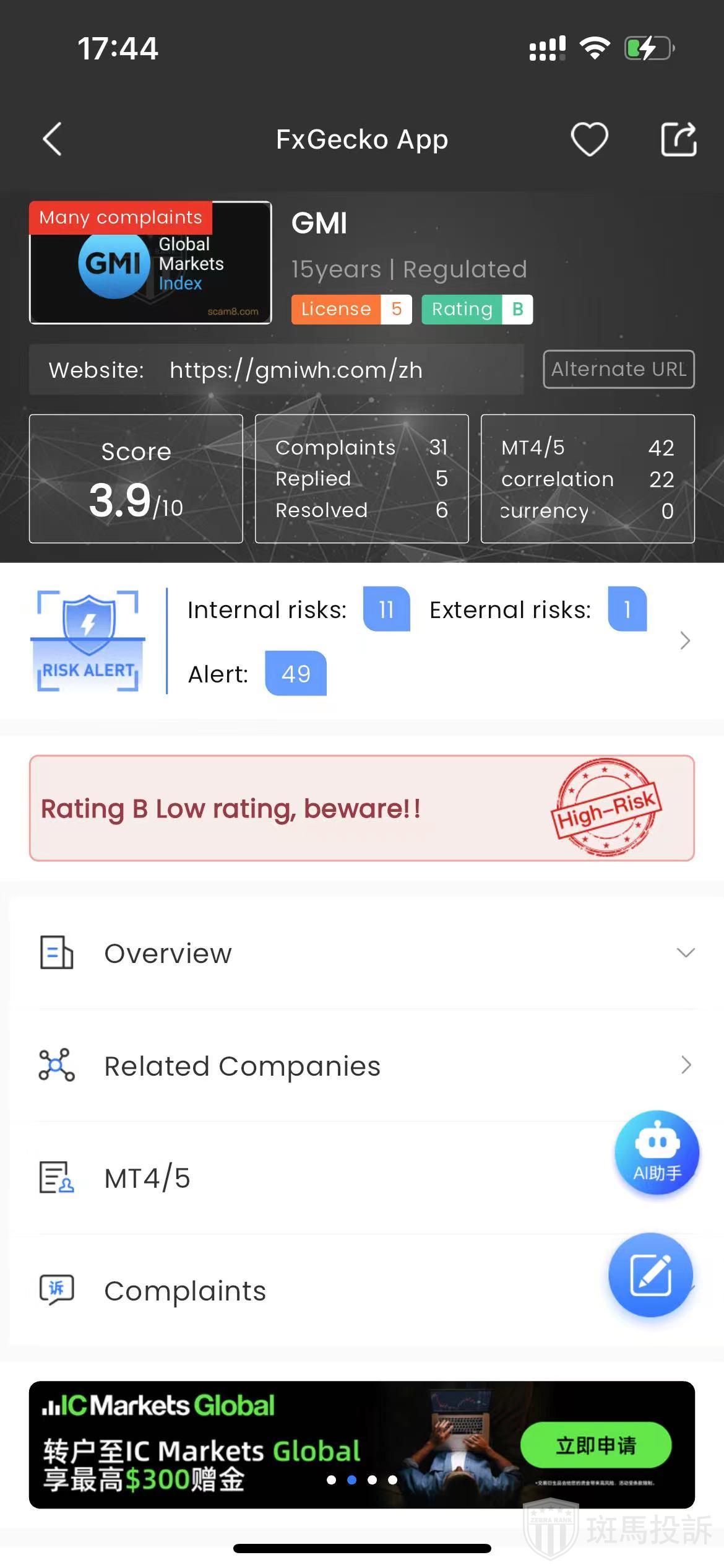 FTI Comprehensive Review: Currently, GMI's official website is operating normally. Complaints mostly relate to slippage, platform freezing, widening spreads, and other trading environment issues. There is a significant amount of negative information, and overall reviews are poor, with fewer trading instruments available.