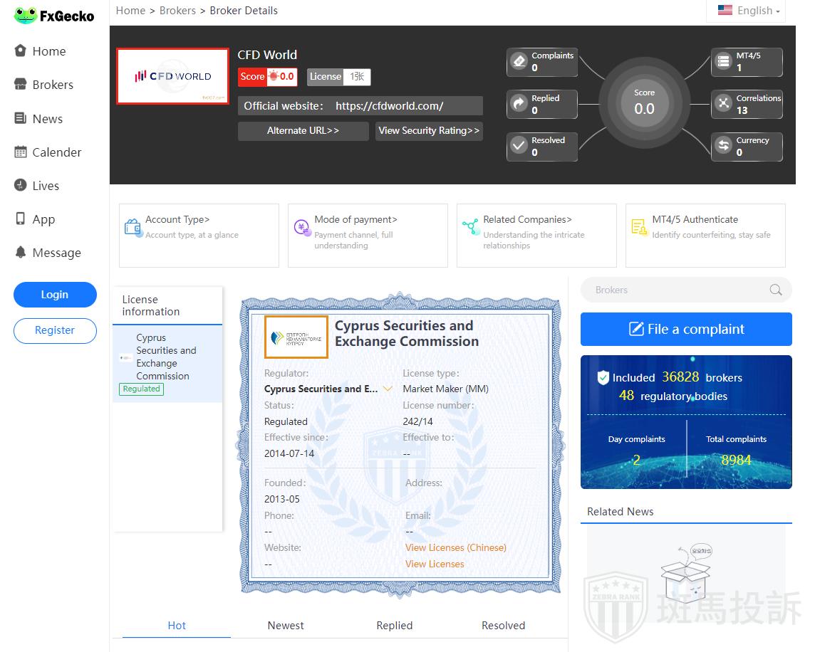FTI has not received any complaints about CFD World forex broker at the moment.