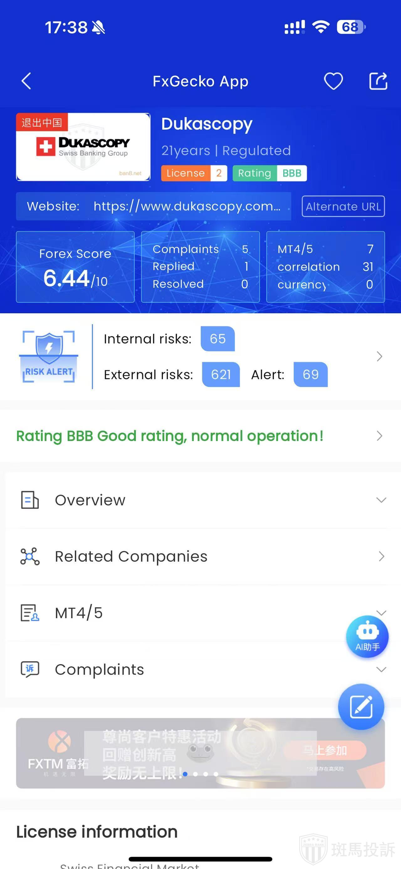According to FTI data, this platform named Dukascopy was established in 2004, ranks 19th globally, has a safety score of 90, and currently holds licenses from two countries, with 751 risk scans.