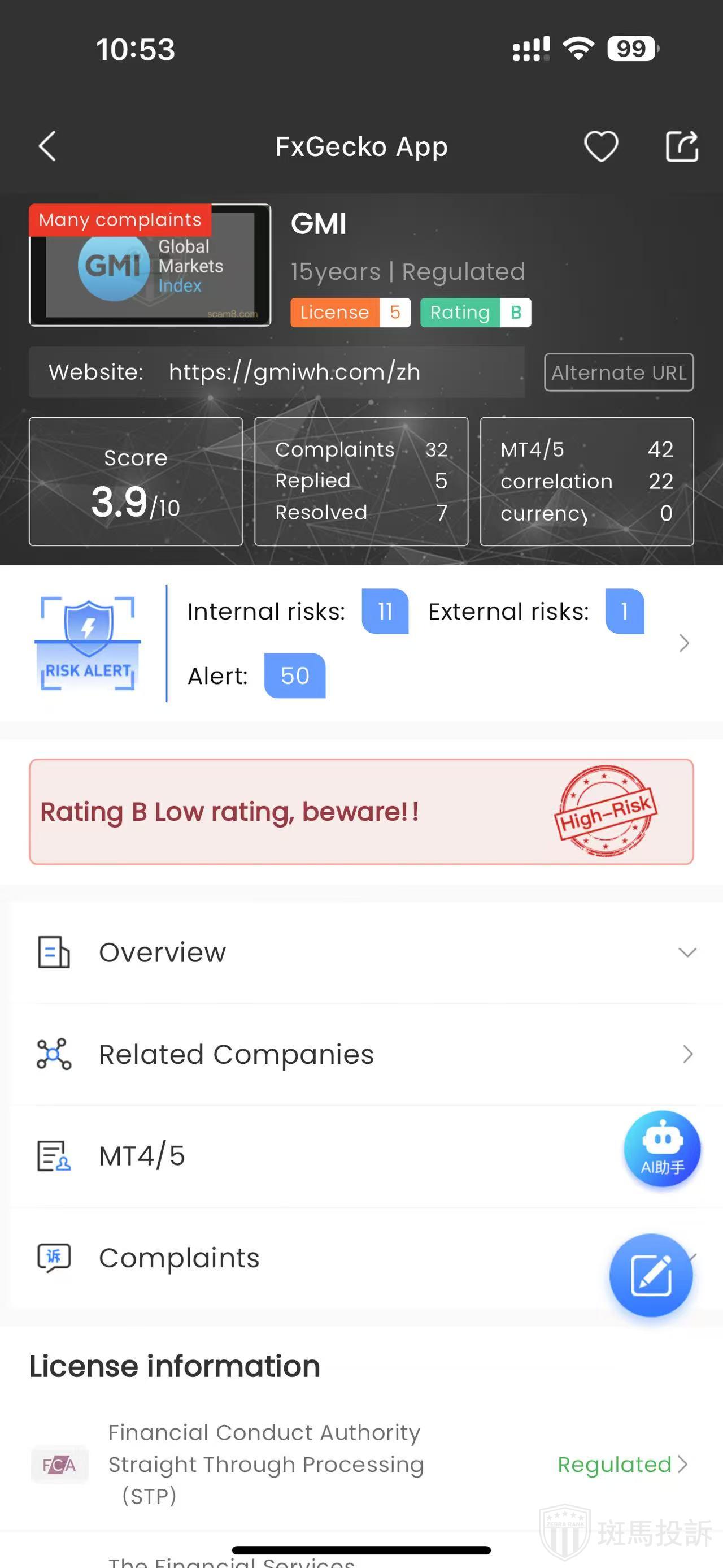 According to FTI inquiries, this platform, named GMI, was established in 2010, ranking 224th globally with a safety score of 70. It claims to hold regulatory licenses in four countries, with 61 risk scan alerts.