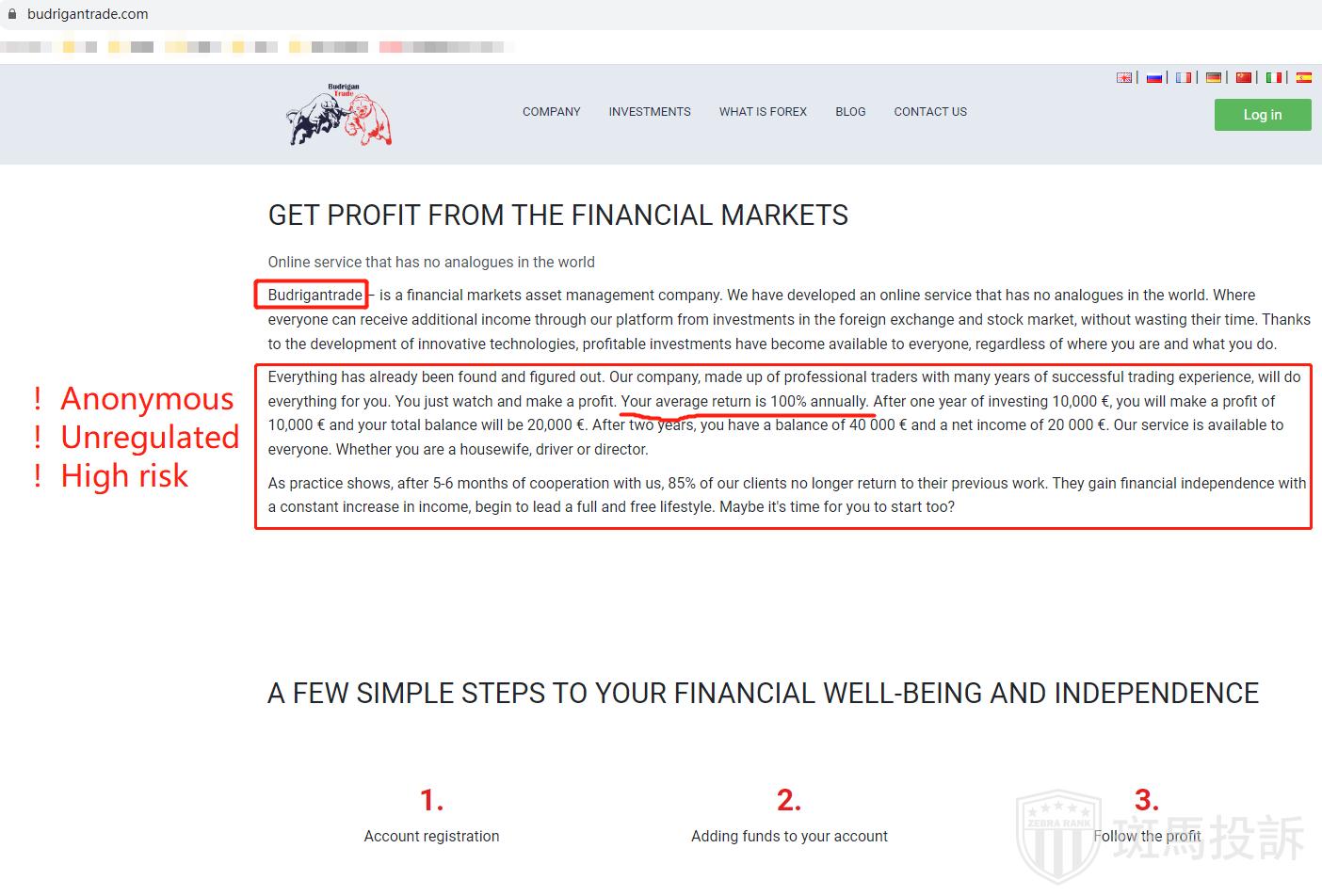 In addition, BudriganTrade is virtually anonymousand unregulated, and the company does not provide proof of a legitimate financial services license for its related business.